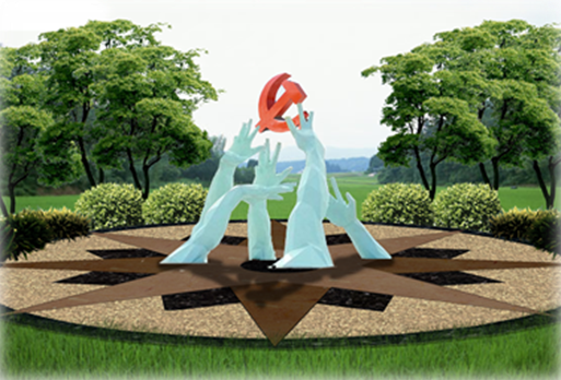核心區(qū)以象征性雕塑彰顯五維共治主題。雕塑由五只手臂和一個黨徽組成,五只手臂象征 “五維共治理念” ;共同捧起的黨徽。喻指在黨的領(lǐng)導(dǎo)下和五維共治“理念引領(lǐng)下,實現(xiàn)山門村的美麗中國夢。