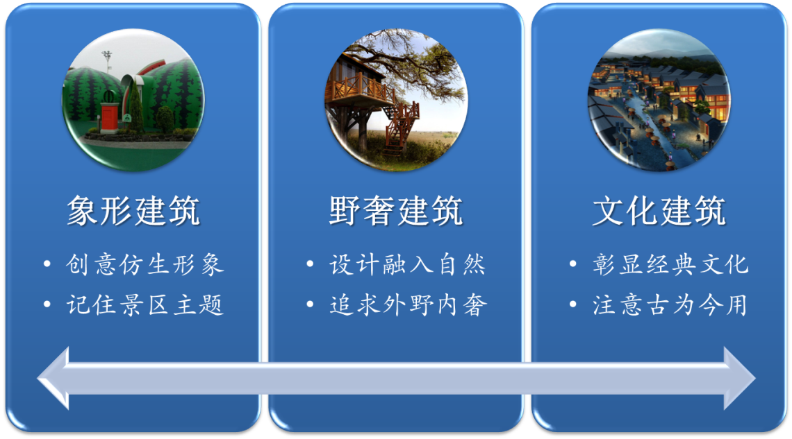 象形建筑設(shè)計(jì):創(chuàng)意仿生形象,記住景區(qū)主題;野奢建筑設(shè)計(jì):設(shè)計(jì)融入自然,追求外野內(nèi)奢;文化建筑設(shè)計(jì):萃取經(jīng)典文化,注意古為今用。