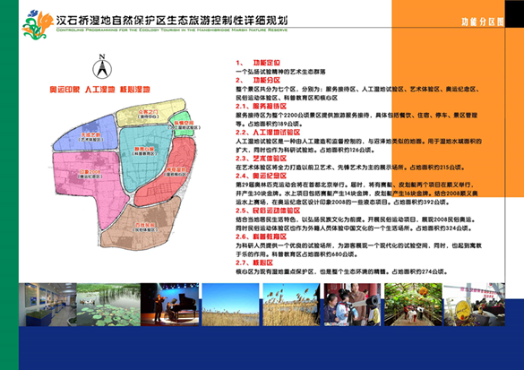 整個景區(qū)共分為七個區(qū),分別為:服務(wù)接待區(qū)、人工濕地試驗區(qū)、藝術(shù)創(chuàng)新區(qū)、奧運紀(jì)念區(qū)、民俗運動體驗區(qū)、科普教育區(qū)和濕地核心區(qū)。