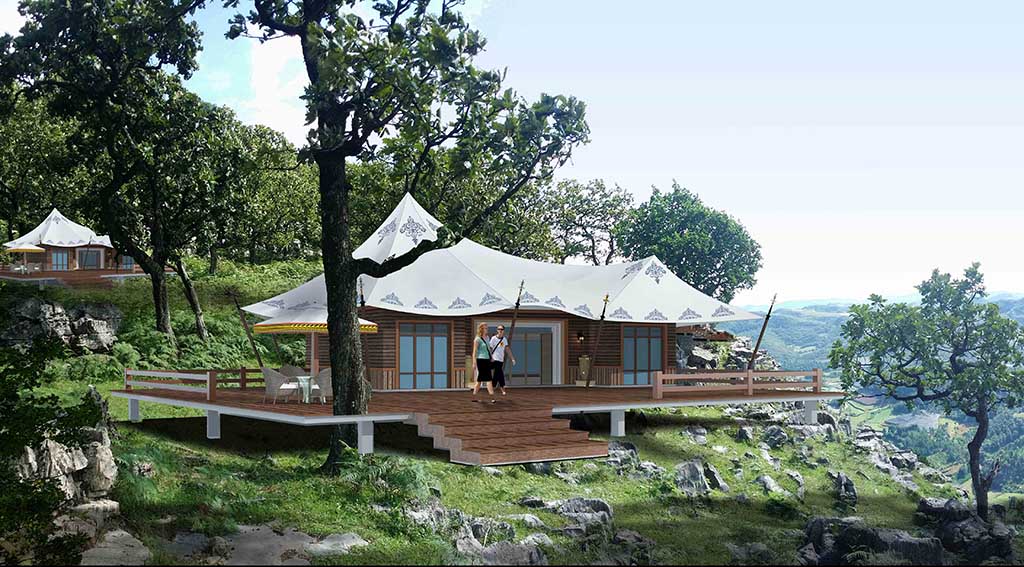 集成化帳篷客房建筑施工周期相對常規(guī)建筑可以縮短一半以上,所有建設(shè)構(gòu)件都可以工廠化生產(chǎn),標(biāo)準(zhǔn)化程度高。建筑垃圾極少,對環(huán)境的污染可以控制在最低范圍內(nèi)。即便是酒店/營地的服務(wù)中心,也可由帳篷客房的組合和功能的改變而成。由于其建筑構(gòu)件的標(biāo)準(zhǔn)化程度非常高,又具備可移動性,可實現(xiàn)遷移再造,對景區(qū)的業(yè)態(tài)調(diào)整比較靈活。