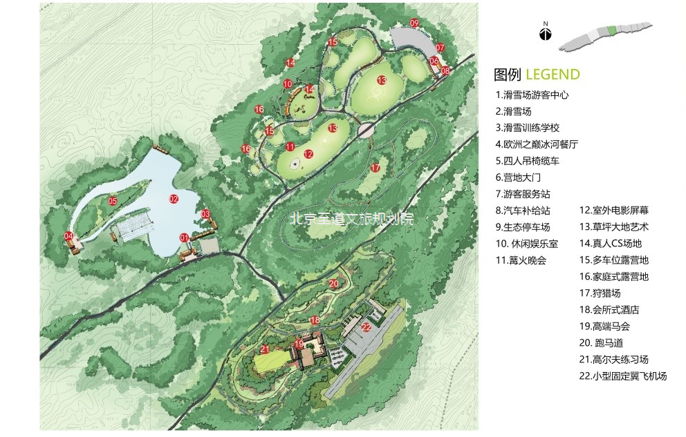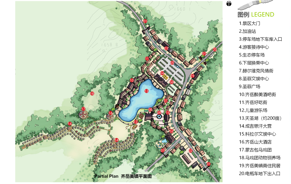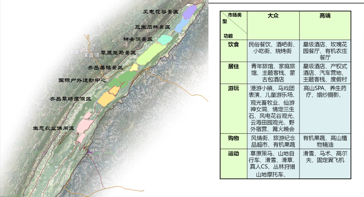 南翼為度假區(qū),包括:國際戶外運動中心、齊岳草場度假區(qū)、生態(tài)農(nóng)業(yè)休閑區(qū)、自然風(fēng)光區(qū)。南北相輔相成,
