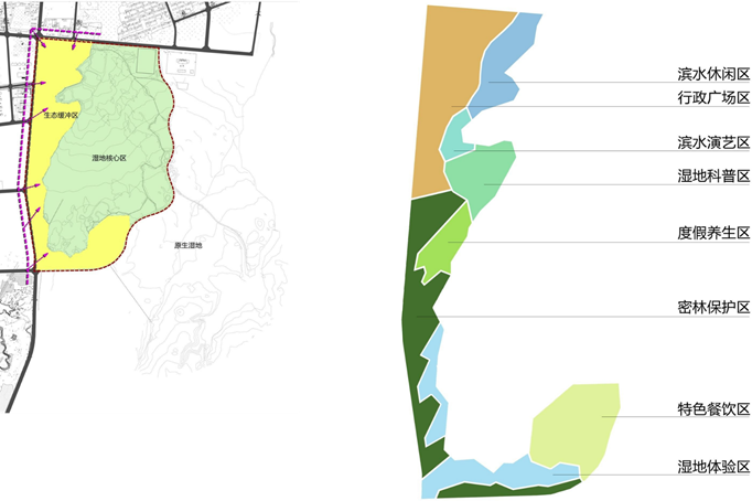 通過對周邊功能、用地性質(zhì)和交通的分析。得到結(jié)論是是:城市無序發(fā)展已經(jīng)導(dǎo)致濕地退化。當(dāng)下應(yīng)重點建設(shè)城市邊界的生態(tài)緩沖帶; 集中資源打造景觀亮點;以最少的投入獲取最大的效益。