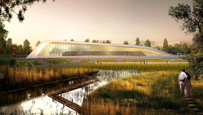 游客中心設(shè)計理念:一是鏤空,盡量不遮擋景觀實現(xiàn),故而采取中空玻璃建筑形式包裹游客中心各種功能;二是抬高,因為濕地缺乏地形起伏變化,缺少游客登高眺望視角,故而抬高后建筑頂部兼具觀光亭臺功能,