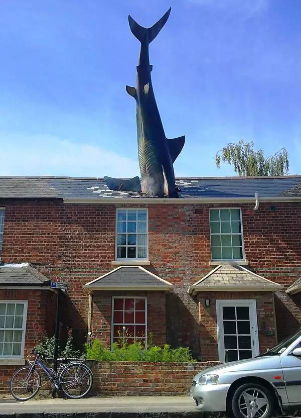 這座7.6米高的雕像也稱《無題1986》。這座雕像最初被市議會視為異類,被要求拆除,但后來還是逐漸被人們所接受。作品在1986年完成,為了紀念美國向日本長崎投放原子彈的41周年。屋主請雕塑家John Buckley設計,并請當地的工匠完成了一只由金屬、樹脂和石膏做成的鯊魚,讓它模仿原子彈的軌跡,一頭“栽進”房頂。