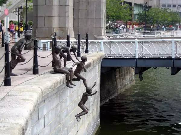 五個赤裸男孩雕像,好象要跳入河中游泳,這是第一代到新加坡移民的孩子常做的體育活動。