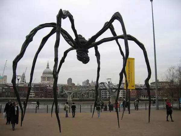 路易斯·布爾喬亞這件著名的作品《母親》已是倫敦泰特藝術博物館的著名景觀之一。布爾喬亞晚期的作品均與自己童年“被遺棄”的創(chuàng)傷經歷有關,父親移情,母親早逝。她將蜘蛛喻作母親,巨大的身軀與細長直入地面的腿,對子女來說是保護,也是牢籠。