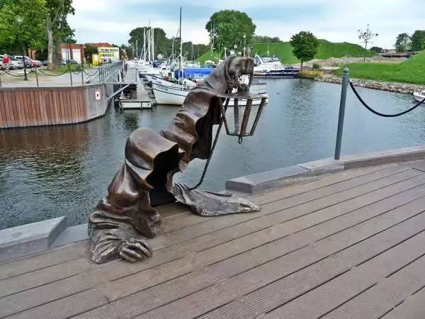 傳在公元1595年,Klaipeda大城堡守衛(wèi),Hans von Heidi,看到了一個不同尋常的幽靈漂浮在河邊。部分游客警告警衛(wèi),糧食和木材也許會在未來一段時間發(fā)生短缺的情況,就像這個黑色幽靈短暫地出現又消失了。于是之后的藝術家就根據這個傳說,真的在水邊建造了這樣一具“幽靈”,夜晚綠燈亮起,使來往的行人更覺恐怖。不過白天看還好,幽靈的斷腳還很別致。