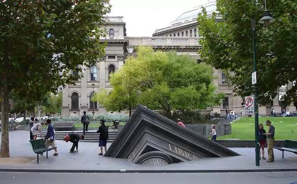 州立圖書館外下沉的大樓,隨著圖書館下沉的是知識,還是一個全民渴求知識的年代?