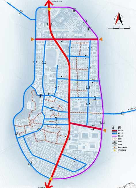 主要通過在老城區(qū)建立完整的步行系統(tǒng)以及結(jié)合現(xiàn)有的204省道來實現(xiàn)。