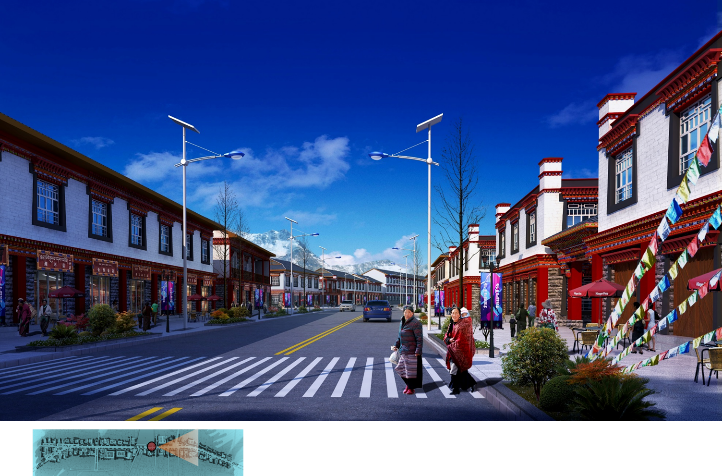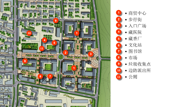 根據(jù)地形特點和功能需求,在鎮(zhèn)區(qū)南北兩側(cè)布置具有對外服務(wù)和展示功能的旅游綜合服務(wù)區(qū)和新型居民點,在東側(cè)通往不丹方向布置綜合商貿(mào)中心,西側(cè)結(jié)合自然山體建設(shè)鎮(zhèn)區(qū)山地公園。由此形成鎮(zhèn)區(qū)的空間布局.