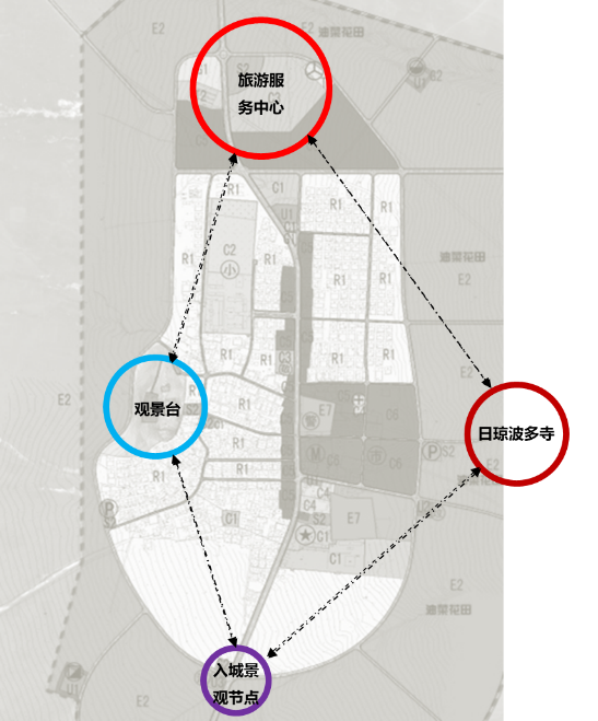 借助地形特點設(shè)置觀景臺及步行道,便于俯瞰全鎮(zhèn),創(chuàng)造豐富的旅游體驗。