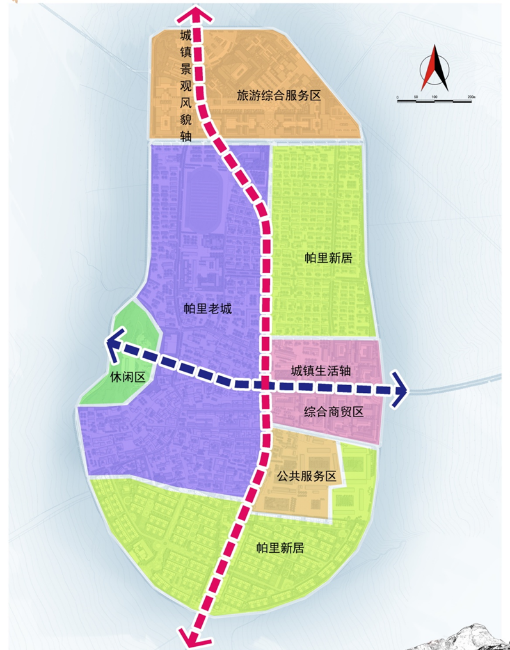 即:兩軸:城鎮(zhèn)景觀風(fēng)貌軸、城鎮(zhèn)生活軸;六大分區(qū):旅游綜合服務(wù)區(qū)、綜合商貿(mào)區(qū)、帕里老城、帕里新居、休閑區(qū)。