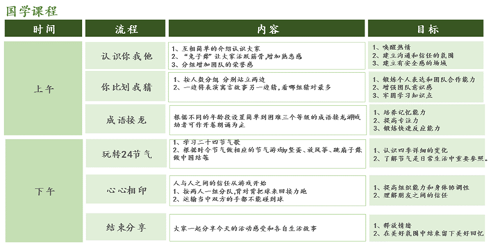 讓孩子在少年時(shí)期積淀足夠的國學(xué)文化素養(yǎng);讓孩子間溝通、合作、團(tuán)結(jié)、信任、領(lǐng)導(dǎo)的能力得以綜合鍛煉