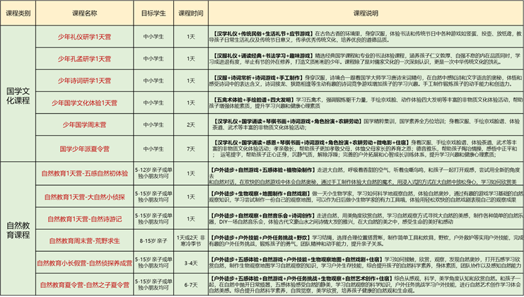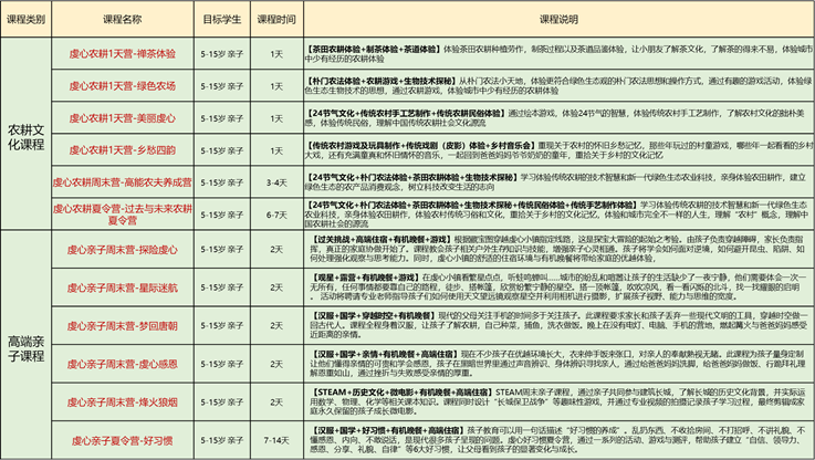 國學(xué)虔心研學(xué)課程分為六個(gè)板塊:國學(xué)文化課程、自然教育課程、科技教育課程、素質(zhì)教育課程、農(nóng)耕文化課程、高端親子課程