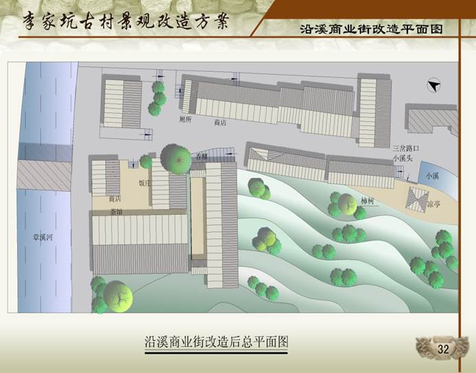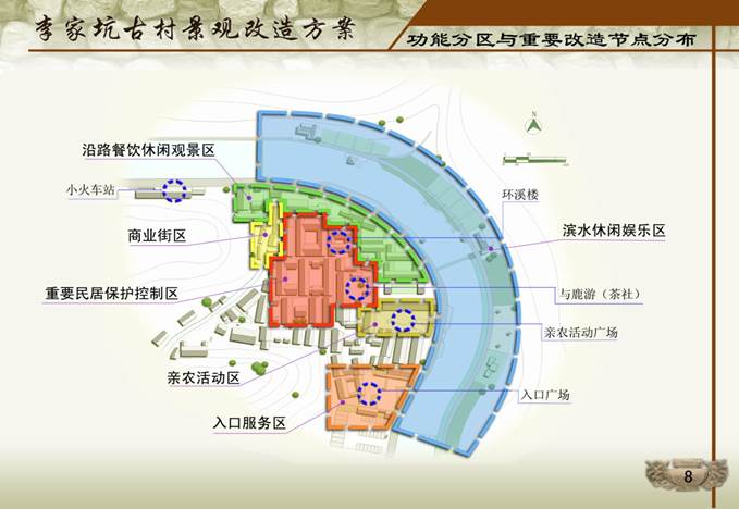 總體規(guī)劃基于原有文脈地脈,既注重古建筑保護,同時導(dǎo)入現(xiàn)代旅游業(yè)態(tài).以章溪水自然地形為基礎(chǔ),規(guī)劃濱水與古村兩大板塊、六個主要功能區(qū)。