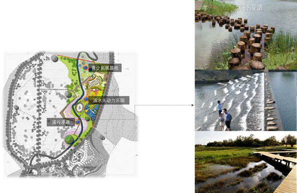 本區(qū)主要項目含溪谷漫道、濱水無動力樂園、青少素質(zhì)拓展基地等。功能上兼顧游親水景觀、親子娛樂、修學(xué)拓展。