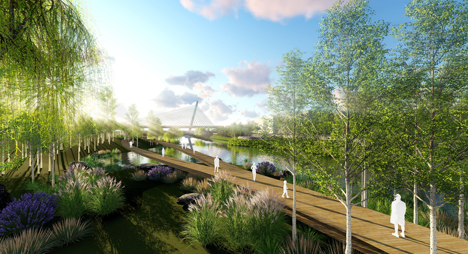 項目基地是煙臺黃金河入海一段。本次規(guī)劃設(shè)計范圍為天津南路橡膠壩以東至入???,河道長度約 4.2 公里,河道寬度 140-170 米,總面積約 68.3 公頃,其中綠地面積約 11.5 公頃,水域面積約 56.8 公頃。