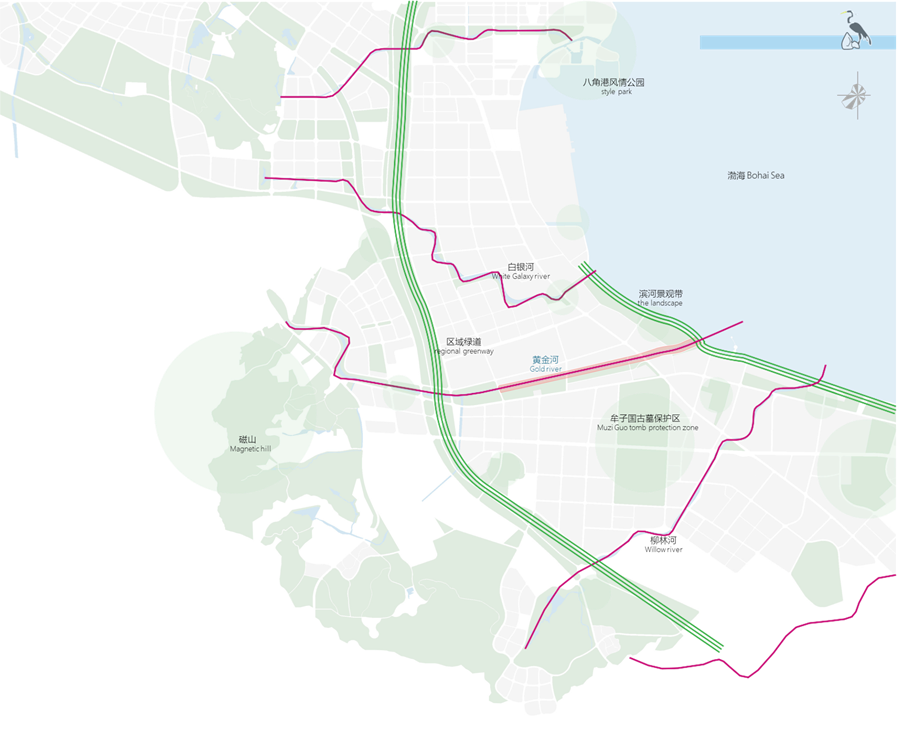 黃金河是煙臺經(jīng)濟(jì)開發(fā)區(qū)古現(xiàn)片區(qū)山城海河城市特色的最佳景觀載 體,是鏈接山 - 城 - 海的重要養(yǎng)生休憩及特色文化型景觀廊道。