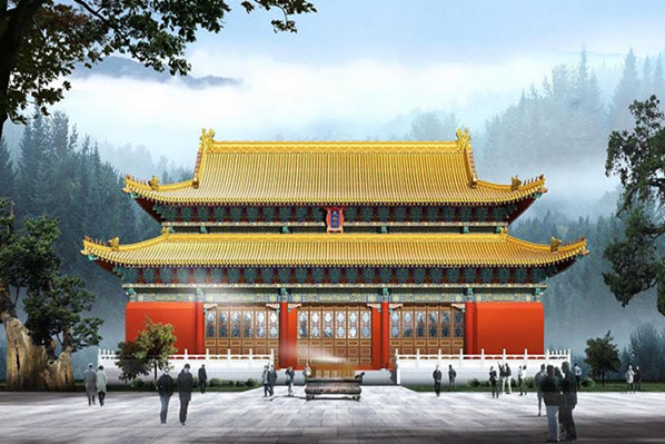 以宗圣宮-說經(jīng)臺為中軸線的道教文化區(qū)占地面積約48.36萬平方米,規(guī)劃建設結合了道教文化概念,總體布局形成“一條軸線、九進院落”,空間序列層次豐富。以太清門、上清門、玉清門三段劃分軸線,形成道教“三清圣境”;以中軸大殿為節(jié)點形成九進院落空間,來表達道教對于世界的認知及其深厚的哲學思想。