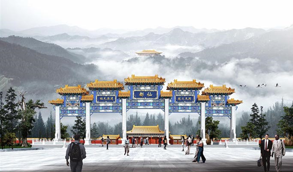 位于整個景區(qū)的入口處,規(guī)劃概念主要運用了“蝙蝠”設計元素,寓意“福地”。廣場內(nèi),運用巨石結合水景的手法展現(xiàn)恢弘大氣氛圍,同時結合景觀柱、大型地雕及涌泉噴霧等元素的巧妙運用,營造出宛若仙境的景觀效果,體現(xiàn)道教仙境的真正含義。