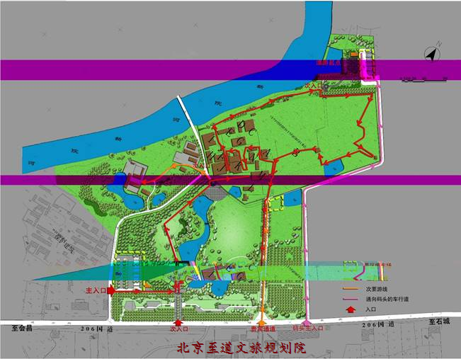 主要車行道起始與206國道形成交叉口,均是由南或西南向北行駛。規(guī)劃紅線寬為30米。該道路是景區(qū)對外聯(lián)系的主要交通。與景觀環(huán)境相結(jié)合,在道路節(jié)點處規(guī)劃安排主入口集散廣場。距離主要停車場有50米。東側(cè)保留原有道路(約10米寬)進(jìn)行了適當(dāng)改造——道路中間增加了一行綠化帶。此道路將作為貴賓通道,驅(qū)車可直接進(jìn)入舊址保護(hù)區(qū)。
