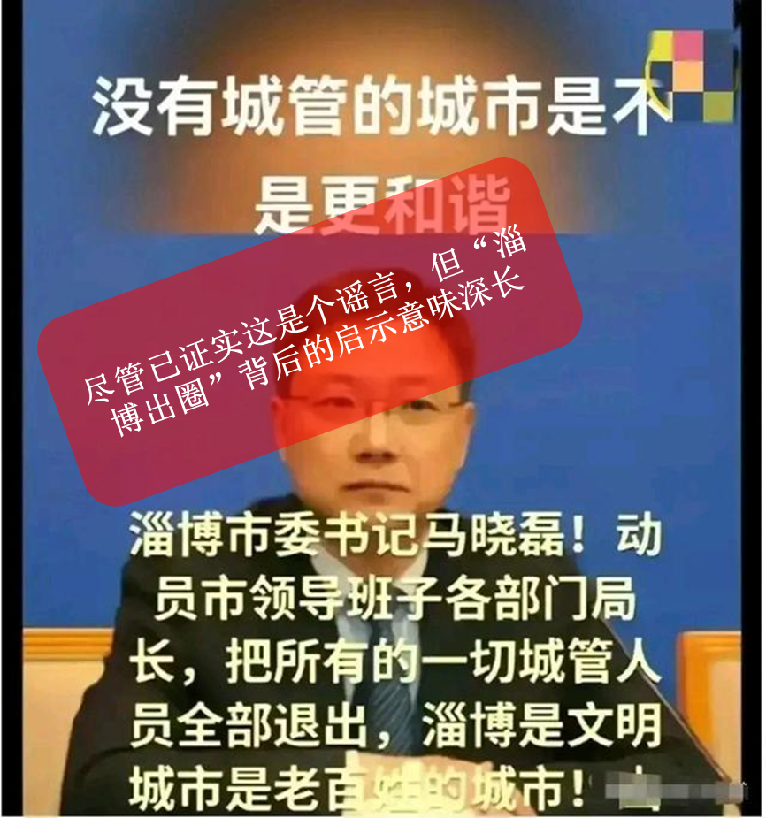 最近網(wǎng)上還出了個(gè)謠言:淄博要取消城管!盡管已經(jīng)官方證實(shí)是謠言。但這個(gè)謠言事件具有很大社會(huì)學(xué)研究?jī)r(jià)值: 可見(jiàn)淄博出圈背后的啟示,已經(jīng)超越旅游業(yè)層面了!