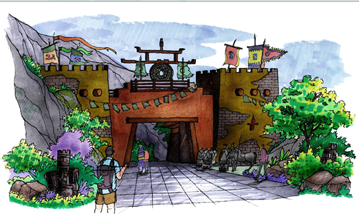 再如“攻克黃臺山”節(jié)點,一方面利用山勢結(jié)合人工造景,再現(xiàn)谷口守關(guān)景觀;另一方面,故事中的道具“云梯車”,不僅塑造成仿古景觀,而且改造成供游客參與“攻谷”互動的游樂設(shè)施;